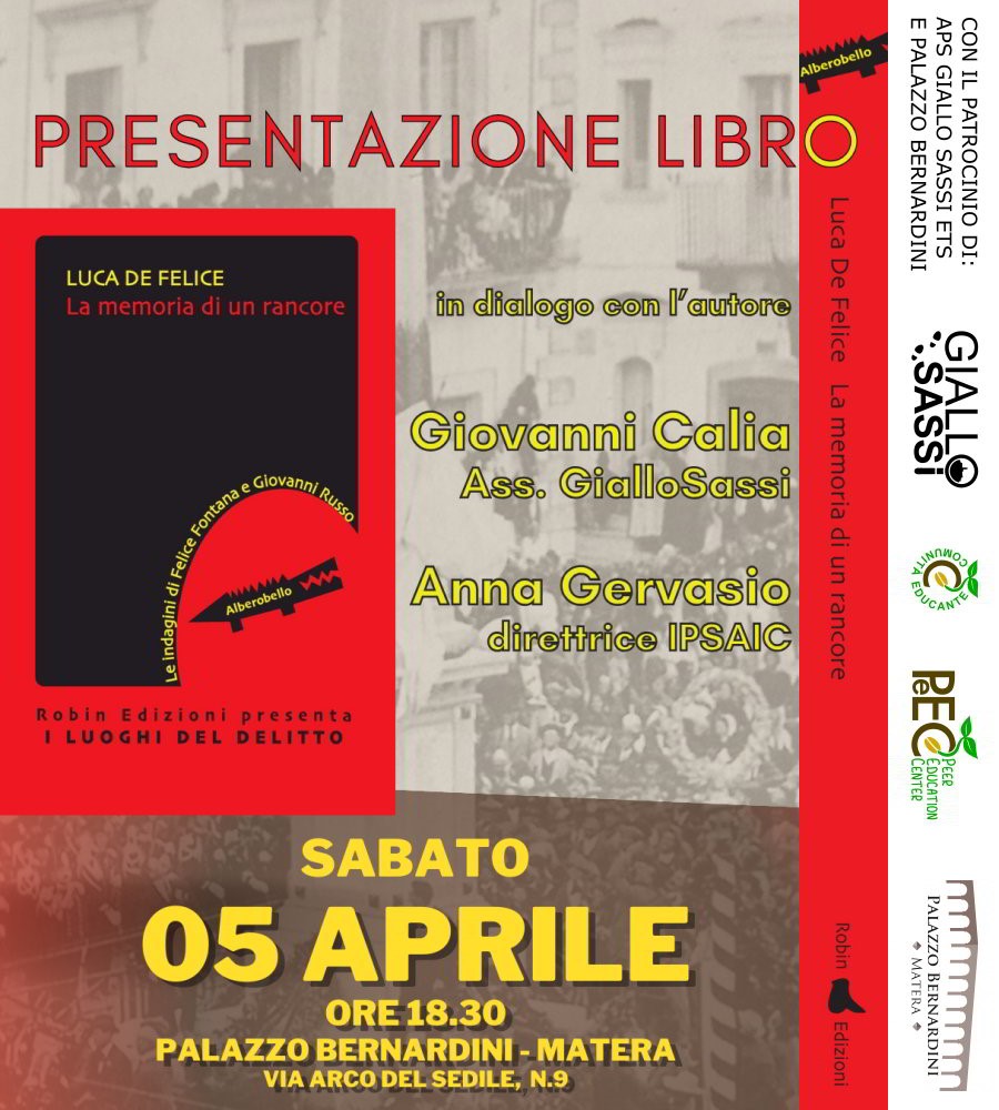“La memoria di un rancore” è il titolo del libro di Luca De Felice che sarà presentato a Matera, presso Palazzo Bernardini (Arco del Sedile n. 9, Matera), sabato 5 aprile 2025 alle ore 18,30, su iniziativa dell’APS Giallo Sassi. Si tratta di un giallo storico ambientato in una Alberobello degli anni ’20 del ‘900 in […]