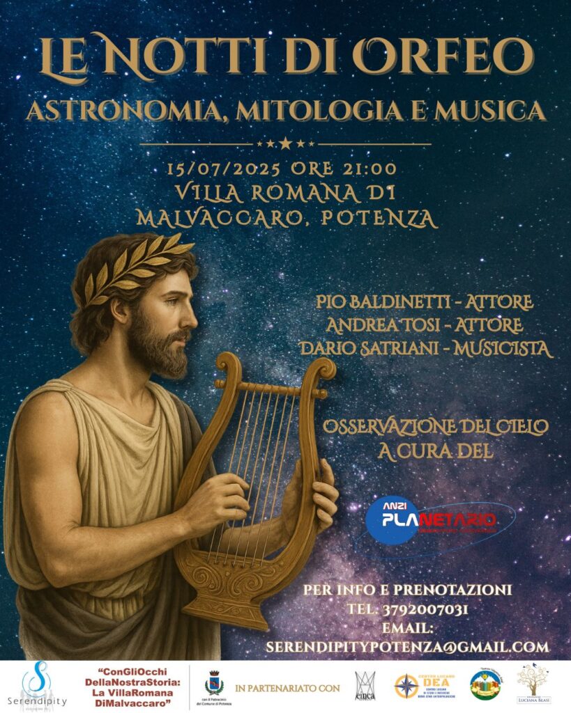 Il 15 luglio alle ore 21 la suggestiva cornice della Villa Romana di Malvaccaro a Potenza ospiterà un evento speciale che unisce astronomia, mitologia e musica. Lo spettacolo vedrà in scena gli attori Pio Baldinetti e Andrea Tosi e il musicista Dario Satriani in una serata dedicata alle stelle in cui la musica accompagnerà i […]