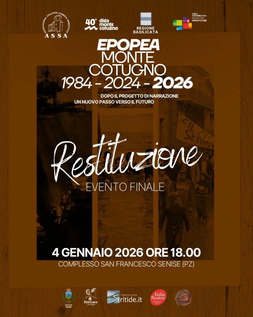 Domenica 4 gennaio, alle ore 18.00, il Complesso San Francesco di Senise ospiterà l’evento finale del progetto Epopea Monte Cotugno, un momento di ”restituzione” degli obiettivi in cui la comunità potrà confrontarsi su ciò che è stato realizzato e sulle prospettive future. Al centro dell’evento ci sarà la presentazione ufficiale della pubblicazione, un prezioso volume […]