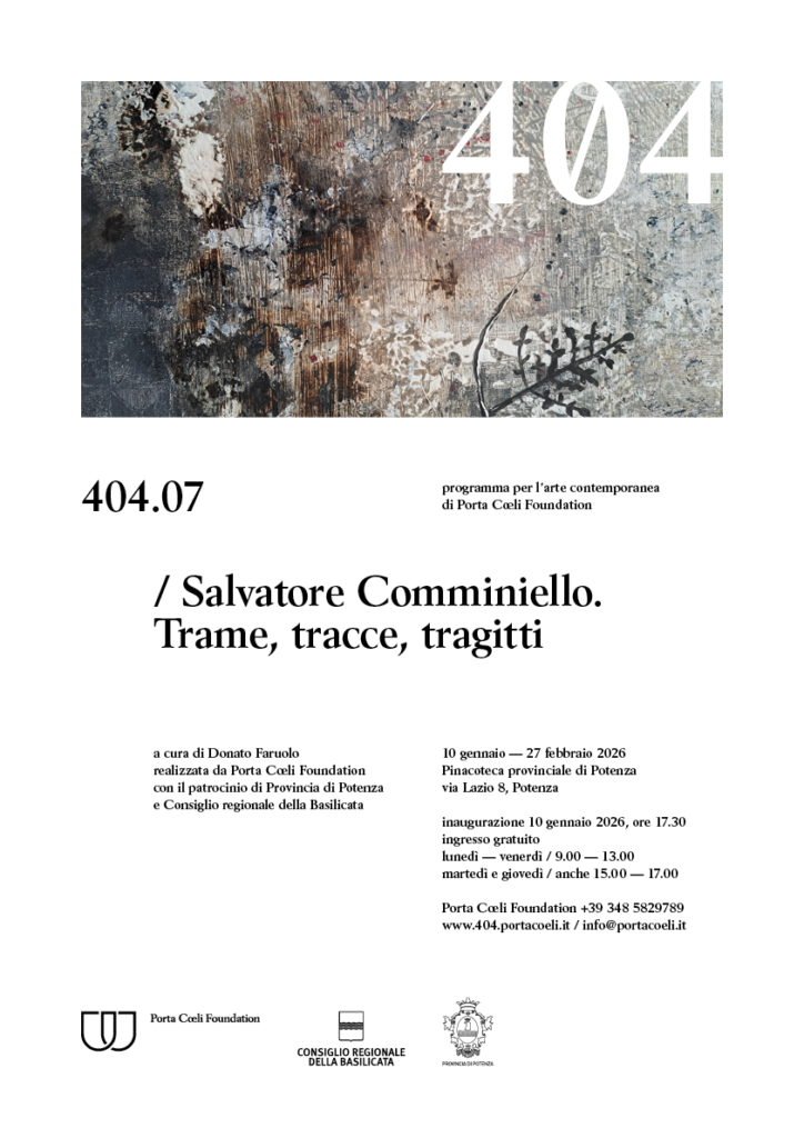 Si inaugura sabato 10 gennaio 2026, alle ore 17.30, Trame, tracce, tragitti, la nuova mostra personale di Salvatore Comminiello che costituisce la settima tappa di 404, il Programma per l’arte contemporanea di Porta Cœli Foundation a cura di Donato Faruolo. La mostra sarà visitabile fino al 27 febbraio presso la Pinacoteca provinciale di Potenza, e […]