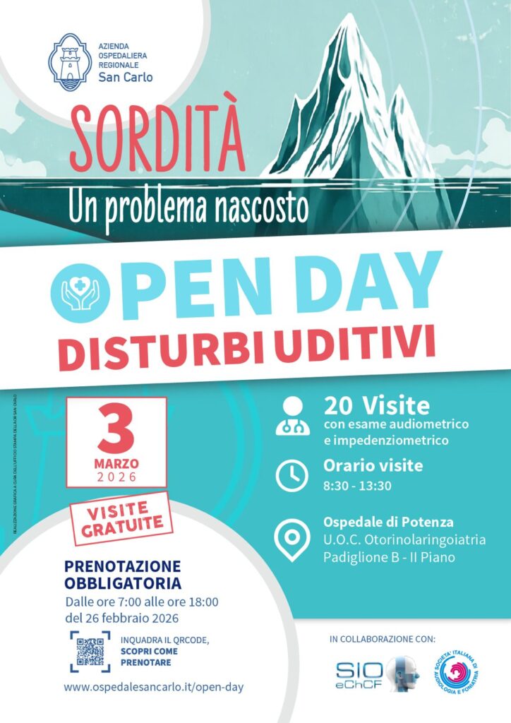In occasione della quinta giornata nazionale di sensibilizzazione sulle malattie dell’orecchio e sui disturbi uditivi dal titolo “Sordità: un problema nascosto”, l’Azienda Ospedaliera Regionale San Carlo organizza un open day dedicato alla prevenzione e alla diagnosi precoce dei disturbi uditivi. Martedì 3 marzo 2026, sono previste 20 visite gratuite, comprensive di esame audiometrico e impedenzometrico, […]