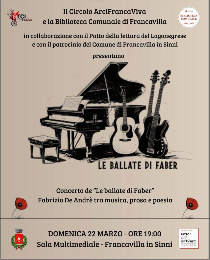 Domenica 22 marzo alle ore 19 presso la Sala Multimediale di Francavilla in Sinni, il Circolo Arci Francaviva e la Biblioteca Comunale celebreranno, tra poesie e musica, il grande Fabrizio De Andrè, artista indimenticabile e sempre attuale. L’evento, nato dalla collaborazione con il Patto della Lettura del Lagonegrese e con il Patrocinio del Comune di […]