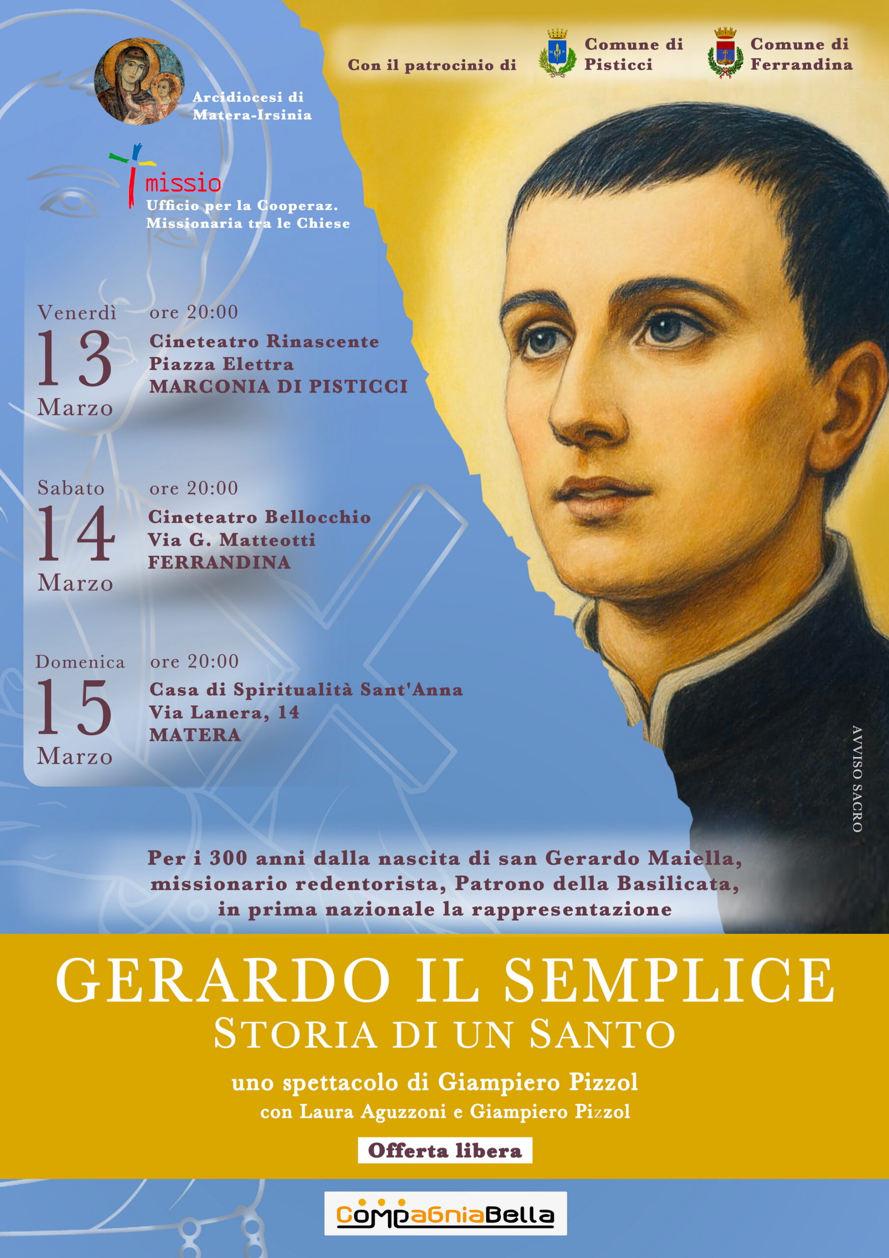 Debutta in prima nazionale “Gerardo il semplice. Storia di un santo”, narrazione teatrale di Giampiero Pizzol, interpretata dallo stesso Pizzol insieme a Laura Aguzzoni. Lo spettacolo sarà portato in scena in tre diverse località della diocesi: il 13 marzo a Marconia di Pisticci, il 14 marzo a Ferrandina e il 15 marzo a Matera.