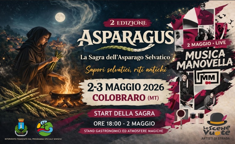 Tutto pronto a Colobraro per la seconda edizione di “Asparagus – sagra dell’asparago selvatico di Colobraro”, la festa dedicata alla valorizzazione dell’identità e della cultura del territorio attraverso un protagonista d’eccezione: l’asparago selvatico. L’appuntamento è in programma sabato 2 e domenica 3 maggio 2026 nel cuore del borgo lucano, tra Via degli Emigranti, Via Lotta dei Contadini e Largo Convento.