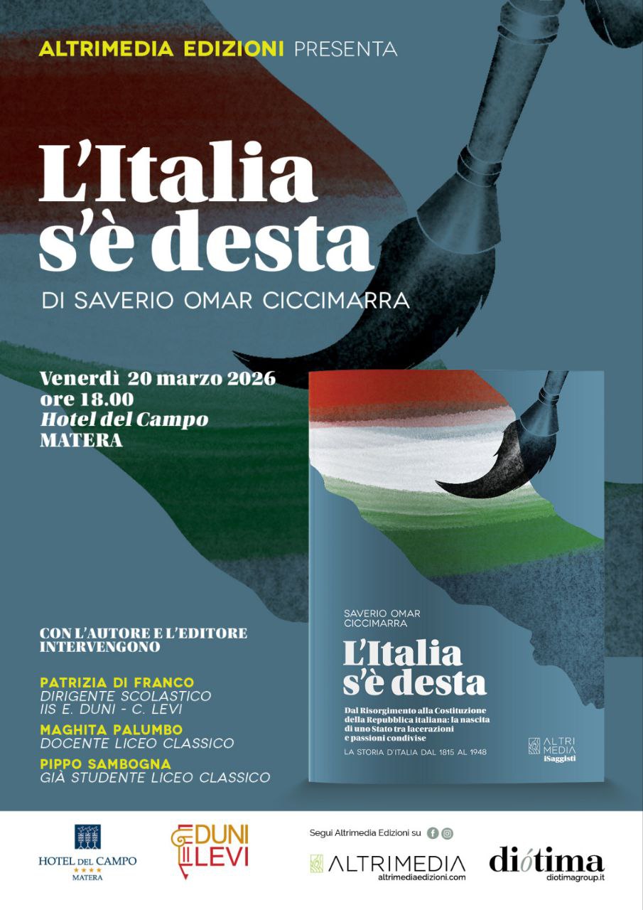 Venerdì 20 marzo alle ore 18:00 presso la sala eventi dell’Hotel del Campo a Matera si terrà la prima nazionale del volume “L’Italia s’è desta. Dal Risorgimento alla Costituzione della Repubblica italiana: la nascita di uno Stato tra lacerazioni e passioni condivise” (Altrimedia Edizioni), l’ultima opera del saggista Saverio Omar Ciccimarra. Con l’autore e l’editore interverranno Patrizia Di Franco, dirigente scolastico IIS E. Duni- C. Levi, Maghita Palumbo, docente Liceo Classico e Pippo Sambogna, già studente Liceo Classico.