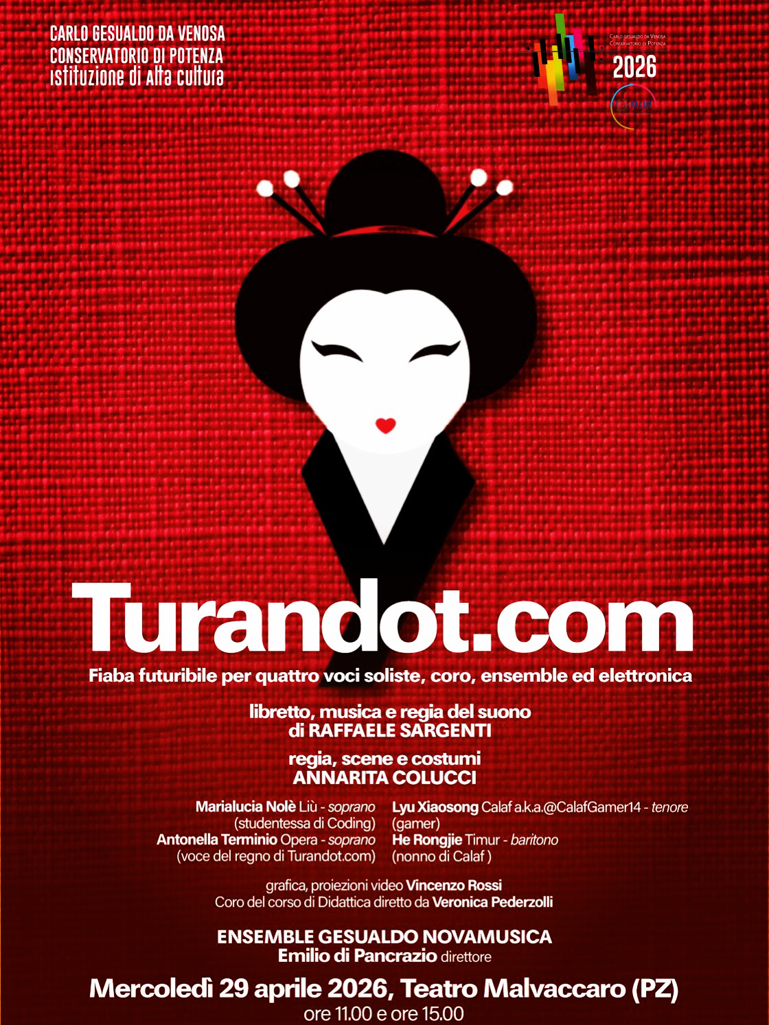 L’opera propone una rilettura contemporanea della celebre Turandot di Giacomo Puccini, inserendola in un futuro totalmente dominato dall’intelligenza artificiale. Attraverso un linguaggio musicale che integra elementi elettronici e rielaborazioni timbriche dei temi Pucciniani, “Turandot.com” offre una riflessione attuale sul rapporto tra individuo e tecnologia, ponendo l’attenzione sui rischi della dipendenza digitale. L’opera si rivolge ad un pubblico eterogeneo e, proprio per questo, il Conservatorio apre le due Recite previste (sino ad esaurimento posti disponibili) a tutti coloro che vorranno prendervi parte facendo pervenire una email di prenotazione all’indirizzo protocollo@conservatoriopotenza.it all’attenzione del Prof. Silvestro che ne coordina la realizzazione.